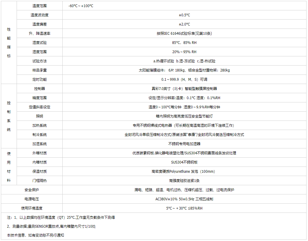 光伏濕凍試驗(yàn)箱適用于光伏組件(太陽(yáng)能電池板)做熱循環(huán)、濕凍循環(huán)、高溫高濕雙85試驗(yàn),以確認(rèn)組件能否承受高溫高濕之后隨之的負(fù)溫度影響,以及對(duì)于溫度重復(fù)變化時(shí)引起的疲勞和熱失效,另外確定光伏組件曝露在高濕度下而產(chǎn)生的熱應(yīng)力及能夠抵抗?jié)駳忾L(zhǎng)期滲透的能力.是光伏組件行業(yè)必不可少的測(cè)試設(shè)備。