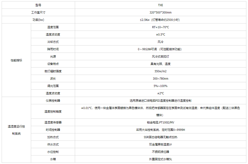 產(chǎn)品簡介:臺式氙燈老化試驗(yàn)箱采用能摸擬全陽光光譜的氙弧燈來再現(xiàn)不同環(huán)境下存在的破壞性光波,可以為科研產(chǎn)品開發(fā)和質(zhì)量控制提供相應(yīng)的環(huán)境模擬和加速試驗(yàn)。TXE型氙燈試驗(yàn)箱可用于新材料的選擇、改進(jìn)現(xiàn)有材料或評估材料組成變化后耐用性的變化試驗(yàn),可以很好的模擬在不同環(huán)境條件下,材料暴露在陽光下所產(chǎn)生的變化。